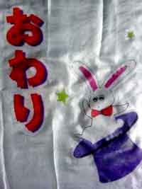 えーっ!そんな事が出来るのなら、私もしたい事があった。マジックの最後に‘おわり‘ というシルクがほしかったがなかなか気に入ったのがなくて困っていた。それをすぐにやってみた(右の写真)。アー嬉しい。すぐに友人にも伝えると大喜びで作り、発表会にも間に合い大成功であった(左の写真)。