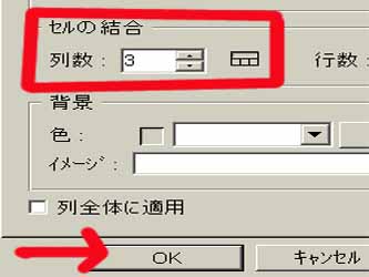 B「セルの結合」の「列数」に3列の時は3と入力して、「OK」をクリック |