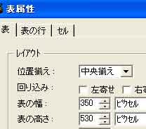 K「表の幅」を350、「表の高さ」を530と入れて「OK」をクリック
