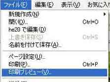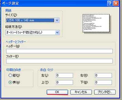 | I左上の「ファイル」をクリックして「印刷プレビュー」をクリック | J「ページ設定」をクリック。サイズは「ハガキ」、給紙方法は「四辺フチなし」、ヘッダーとフッターは消します。余白は上・下・右・左、全て「0」と打ち込む。そして「OK」をクリック |