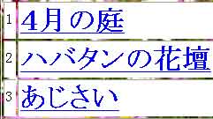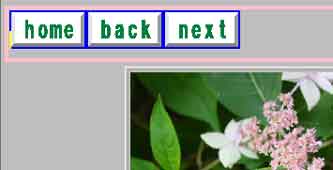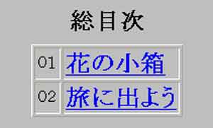 「難しい。難しい。」と言いながら上の@図を見ながらボタンをはっていきました。そしてA図のように「hana02」のページの場合は、「02ページの前は01ページだからbackは01」。「02ページの次は03ページだからnextは03」と、ボタンにリンクしていきました。まるで小学1年生のように声に出しながら作業をしていきました。 「hana01」〜「hana03」までのページが繋がると、今度はB図のように花の小目次「hana_ndx」を作ります。その小目次から「hana01」、「hana02」と、行ける様に繋げます。リンクが出来ると、文字の下にアンダーラインが入るのでわかります。 こうして、目次から各ページへ、また各ページから目次へ相互リンクが出来ます。 このようにして小目次が複数出来たらC図の様に総目次を作ります。総目次から小目次のページ「hana_ndx」と「tabi_ndx」を繋ぎます。小目次から総目次へも勿論リンクで繋ぎます。 すると、トップページ「index」から全てのページに行ける様になるのです。 さて、ドキドキしながらエクスプローラー画面で総目次のページからクリックしてみました。リンクしたページが瞬時に現れた時の感動は、叫びたいような気持ちでした。 そして、「next」のボタンをクリックすると目次に戻らなくても次々と進めます。パソコンというのは何という凄い事が出来るのでしょう!上手く表現する言葉が見つかりませんが、私も仕事人になれた様な気分でした。苦労したからよけいに喜びも大きかったと思いました。 『ページをいくら作ってもリンクをしないと、それはデーターベースであって、情報処理ではない。何万ページあってもトップページから幾つかクリックすればそのページに直にいくようにリンクしておくのが情報処理というのだ。』と、いうのは師匠のよく言う言葉です。私もこれで情報処理の世界の入り口に来られました。本当に、昔の私から見るとトンデモナイ大変な世界に足を踏み入れたものです。自分でも信じられないと思いつつ今日もパソコンに向かっています。 | ||||||||||||||||||||||||||||||||||||||||||||||||||||||||||||||||||||||||||||||||||||||