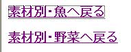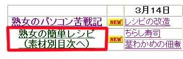 | 師匠は何時も「ホームページ」は見る人の立場でアップしないとだめだと、言います。言葉では私もその通りと思います。が、さて自分の「ホームページ」はそうなっているかと見直す時、はなはだこころもとないです。ひとの「ホームページ」を見るとよく分かるのですが自分のはどうしても甘くなって、作る立場のページになってしまいがちです。 そういう事から自分のレシピを見ると、問題があると思いました。何人かの人に感想を聞くと、やっぱりそうでした。そこで一念発起してレシピの改造に取り組みました。 レシピは10年程、毎月2個アップしてきたのでざっと計算しても200ページはあります。それを変えるとなると大変な作業です。私がしたいのは @.野菜と魚は名前ごとにする。並べ方は50音順にする。 A.必ず素材別の小目次に帰るようにする。 B.漬物やお菓子・肉など今までのやり方も残す。 というような方針を立てました。すると、今までの「next」・「back」のボタンが邪魔になってきます。それで各ページに付けていたボタンを全部取り外しました。色々なページからリンク出来るようにしたのです。 迷子にならないように小目次には、「next」・「back」の代わりに、言葉で素材別のページに帰るようにしたのです(下の写真)。
