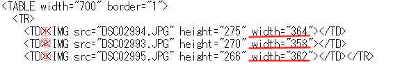 | @枚目の写真の幅は364、2枚目は358、3枚目は362ピクセルです。 3枚を足すと1084ピクセルになります。 この表の幅を700ピクセルに設定しているので700をオーバーしています。それで収まってくれなかったのです。 そんな時は、(700÷3で) 1枚が230なら収まってくれます。フォトショップ エレメンツで手直しをします。 |