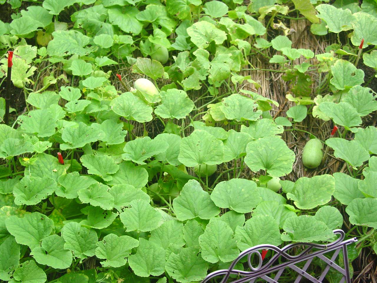 | 6月初めの頃、庭の芝生をはがして1坪程に「網干メロン」を3本うえました。よく成長して