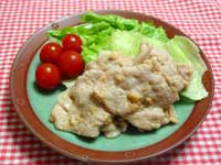 @. ボールに調味料を入れ、そこへ豚肉を入れてもみこみ、10分ぐらいおく。 A. フライパンにサラダ油大さじ1を熱して@の肉を広げて焼き、つけ汁をかけて煮からめる。 B. 皿に野菜といっしょに盛りつける。 |