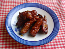 | 地元「陸公民館」の「学校給食のレシピをご家庭でも」という講座で教えてもらいました。 これは豚肉を親指ぐらいの太さに切るので子どもは勿論、歯の悪い老人でも食べやすく、しかも味がよく絡んでいいです。味噌だれが甘くて、冷めても美味しいです。 |