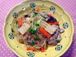 | 豚肉・・・100g 緑豆春雨(乾)・・・90g 人参・・・40g ピーマン・・・1個 茹でたけのこ・・・40g 生しいたけ・・・2こ(40g) 生姜(千切り)・・・1かけ分 A 水・・・1/2カップ しょうゆ・・・大2 酒・・・大1 味醂・オイスターソース・・・各大1/2 砂糖・・・小2 チキンスープの素・・・小1/2 |