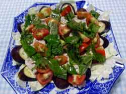 1.なすは7mmの斜め薄切りにして塩水につけておく。 豚肉は5pに切る。 キャベツはざく切り、ミニトマトは4等分に、シソの葉は1pぐらい にちぎっておく。 2.耐熱皿にキャベツを敷く。 その上に水気を切ったなすと豚肉を円状に並べて塩をかるくふ り、酒 をまわしかける。 ふんわりラップをして、電子レンジ(600w)で8分加熱する。 3.Aとミニトマト、シソの葉をかける。 |