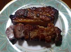 1.付け汁をナイロン袋に入れ、その中に肉の塊を入れて空気を抜いて絞り、冷蔵庫で2日程漬ける。途中で袋の上下を返す。 2.オーブンで焼く1時間ほど前に室温で置く。 3.天板にアルミホイルを敷き、その上に網を敷き、200度に予熱したオーブンで15分焼く。 4.付け汁を刷毛で全体に塗り、20〜25分焼く。(上段で焼いた方がこんがり焼ける) 5.取り出したら、まな板の上に10分ほど置いて肉汁を落ち着かせる。 6,7〜8mm幅に切り、盛り付ける。 |