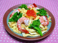 すし飯 1.米はだし昆布を入れて普通に炊く。だし昆布を取り除き、あわせ酢(酢50cc・砂糖大さじ2・塩小さじ1/2)を入れて混ぜる。 中に入れる具を作る。2.干椎茸は1カップの水に入れて前の夜から冷蔵庫に入れて戻して、やわらかくなったら薄切りにする。 3.人参、こんにゃく、ごぼうは細い千切りにする。干椎茸の戻し汁1カップに砂糖・しょうゆ・味醂を各大さじ1を入れて煮立たせ、ABの野菜を煮含める。 4.熱湯に塩1つまみを入れて菜の花を茹で、次にえびを茹でる。 錦糸卵 5.卵は割りほぐして、塩少々を入れて混ぜ、よく熱したフライパンに少量を入れて、ほぼ固まったら箸を入れて裏に返して薄焼き卵を作る。よくさましたら、くるくると巻いて細く切り、箸でほぐしてフワッとさせる。 仕上げ 6.汁けを切った野菜を、人肌に冷ましたすし飯に混ぜる。 7.器にEを盛り、錦糸卵を全体にのせ、いくら・えび・菜の花を飾る。 |