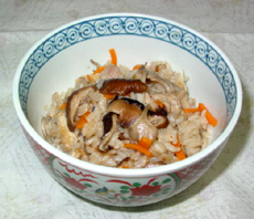 準備・・・干椎茸は前夜水につけておく。(この戻し汁を使う) 1.鶏肉は5mm程に切り、薄口醤油大さじ1と酒小さじ1をふって揉み込む。 2.干椎茸は薄切り、まいたけも食べやすい大きさに切る。人参は短冊切り、薄あげは油抜きをして短冊切りにする。 3.洗った米に椎茸の戻し汁と水を加え、普通の水加減をし@を加えて混ぜ、上にAの具を入れて炊く。 |