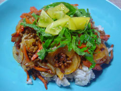 | 美容院でパラパラ本を見ていたら「タコライス」といって美味しそうな写真があり、気になっていました。 インターネットで調べてみると、『メキシコのタコスという料理』が元です。それがアメリカで人気になり、 米軍統治下の沖縄に持ち込まれて、ご飯の上に野菜や肉の具をのせた「タコライス」に変身したようです。 あの蛸が入っているわけではないのです。 新鮮な黄色トマトも手に入った事だし、作ってみました。チリソースは無かったので入れなかったのですが、ケチャップとカレー粉が効いてなかなか美味しかったです。彩りに緑がほしかったので庭の青じそをのせました。 食べ物やさんの「賄いご飯」としても有名だそうです。冷蔵庫の残り野菜を使った『洋風どんぶり』といったところでしょうか。手軽なお昼ご飯にいいです。 |