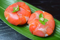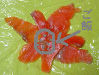 @すし飯に生姜の千切りとごまを入れて混ぜて、さます。 Aラップを30cmほど切って、その上にサーモンを放射状に並べる。 Bさましたすし飯を手で軽く丸め、サーモンの上に置き、茶巾しぼりの様に絞る。底を親指で押さえてラップを外す。 C最後に中央にわさびをのせる。 |