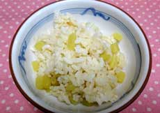 1.米は洗って、酒・塩と蕗の葉を入れて普通に炊飯する。 2.鍋に沸騰した湯にタンサンを入れて、そこに蕗を入れて3分程茹でてアク抜きをする。水に取り出し皮をむいて小口切りにする。 3.米が炊き上がったら、蕗の葉を除き、Aの蕗を混ぜる。 |