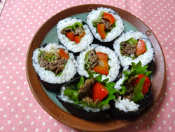韓国風ののり巻きです。色も鮮やかだし、ボリュウムがあります。