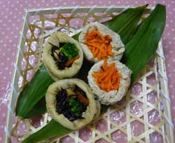 油あげの煮方 1.あげは鍋に湯を沸騰させている所に入れて、4〜5分煮て油抜きをする。ザルに上げて水気を切る。 2.鍋に@を入れて、@のあげを入れて水気がほぼ無くなるまで煮る。 ひじきの煮つけ 1.ひじきは水に30分つけて戻し、水を切る。人参は千切り。インゲンかブロッコリーは茹でておく。 2.鍋に油を熱し、@のひじきと大豆を炒め、だし汁を入れて中火で煮る。 3.10分程煮て、調味料を入れて人参。青味を入れてから落し蓋をして柔らかくなるまで、中火で5〜10分煮含める。 どちらもが冷めたら油揚げに詰める。 |