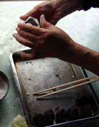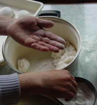 1.餅粉と砂糖を耳たぶぐらいの柔らかさに混ぜて1晩ねかせる。(濡れぶきんをかけておく)