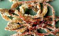 2.鍋に水気が無くなったら火を止め、グラニュー糖を敷きつめた皿につくしを並べてグラニュー糖をまぶす。