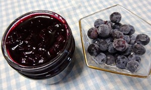 | 我が家のブルーベリーです。粒を冷凍して、そのまま食べても暑い日には爽やかです。 また、この様にジャムにしてヨーグルトにのせて食べても美味しいです。 これは砂糖を30%にしましたが、もっと多く入れても良いです。 砂糖は多くすると長期保存が出来ます。 |