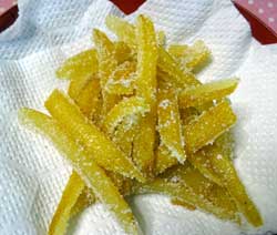1.文旦の皮をむき、茹でる。白いわたは、包丁で半分ほど削ぎ落す。 鍋に水と皮を入れ、沸騰したら取り出す。 2.冷水で水洗いし、茹でる。これを3回繰り返す。(アク抜き) 3.1晩水につけておく。これで、苦みがとれる。 4.皮の水気を切って、5mm幅の短冊切りにする。 5.鍋に皮とグラニュー糖と水を入れ、箸で混ぜながら中火で10分程煮詰め、水気を飛ばし、粗熱をとる。 6.クッキングシートを敷いた天板に広げ、100度Cに予熱したオーブンで30分程加熱し、粗熱をとる。 7.仕上げに グラニュー糖を20gまぶしたら出来上がり。 |