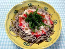 @.鍋にたっぷりの湯を沸かしてトマトを入れる。20秒ほどしたら取り出して皮をむき、1cm角に切る。ボールに入れ、納豆を加えてよく混ぜる。 A。蕎麦を茹で、冷水で冷やし、水気を切る。 B。器にAを盛り、長いものすりおろしと@をかけて青じそをのせ、@をかける。 |