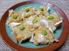 1.玉ねぎはみじん切りにして、片栗粉をまぶす。そこへミンチと調味料Aを全て入れて ぐちゃぐちゃ混ぜる。 2.シューマイの皮にスプーンで@のたねをつめて、グリンピースをのせる。 3.フライパンに油をひいてAのしゅうまいをのせていき、水1/2カップ入れて蓋をして中火で10分蒸したら出来上がり。 4.味ポンをつけて食べます。 |
