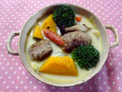 1.玉ねぎ1/4個はみじん切りにし、Aの材料とよく混ぜ、12個に丸める。 2.Bの野菜は一口大に切る。 3.ブロッコリーは、小房に分けて、茹でておく。 4,フライパンにサラダ油を熱し、@に小麦粉を薄く付けて表面を焼く。 5,鍋にサラダ油を熱し、Aを炒めて、水・コンソメを加える。煮立ったらCの肉を入れ、野菜が柔らかくなるまで10分程煮る。 6.牛乳を入れ、弱火で温め、塩コショウで味を整える。 |