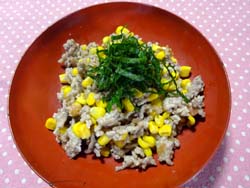 1.梅干しは種を取り、小さくたたいておく。調味料は合わせておく。 2.フライパンに油をひき、中火で豚肉をしっかり炒めて、脂をふき取る。 3.そこへ、トウモロコシを入れて炒める。火が通ったら調味料を入れて混ぜ、全体になじめたら出来上がり。 4.器に盛り付けて、青じその細切りを乗せる。 |
