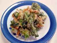 @長ネギは小口切り、三つ葉は2cmに切る。 Aボールに卵・冷水を混ぜ合わせ、薄力粉と片栗粉をふるいながら入れる。 B桜えびと@と白ゴマを入れ、さっくり混ぜ合わす。 C油を170℃に熱してBを落とし入れ、からりと揚げる。 ★片栗粉を入れるとカラッと揚がる。 |