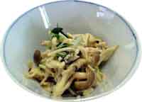 @茸は、いし付きを取り酒(大さじ1/2)をふりかけて空炒りする。 A三つ葉はさっと茹でて2〜3cmに切る。 Bしらす干しは熱湯をかけておく。 Cイカは茹でて食べやすく切っておく。 D調味料を合わせて@〜Cの水気を切って和える。 |