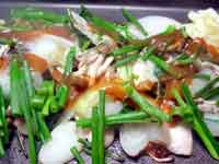 1.秋鮭は3枚におろし、半身又は、食べやすい大きさに切る。 2.にら・白菜は食べやすい大きさに切り、玉ねぎは輪切りにする。生椎茸・えのき茸は食べやすく切る。もやしは洗って水をきって置く。 3.みそタレを左記材料で作る。 4.ホットプレートに油とバター少々をしき加熱して、皮を下にして@を焼き、火が少し通ったら、Aの野菜を並べBのみそタレをかけ、蓋をして蒸し焼きにする。 5.焼きあがったら鮭の身をほぐし、野菜・みそタレをからめて食べる。 |