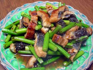 @.ニンニク芽は3cm位に切り、熱湯に塩を入れてサッと茹でる。