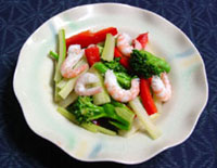 1.海老は背わたを取り除く。ブロッコリは小房に切り、塩を加えた熱湯で茹でる。 2.パプリカはへたと種をとって短冊に薄切り、セロリも薄切り。 3.ドレッシングを混ぜて、その中に@・Aを入れてしばらく置き、味をなじませる。 4.材料を混ぜて皿に盛り、ドレッシングをかける。 |
