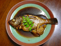 | 近所の方から「主人が釣ってきた」という新鮮で立派なめばるをいただきました。めばるはお客様やお祭等のご馳走の魚です。そこで張り切って煮付けました。その美味しかった事! 食べた後の煮汁は捨てないで、冷凍保存しておきます。これは野菜やおからを煮るときに使うと味が濃厚になります。(近所の先輩主婦に教えてもらった生活の知恵です。) |
