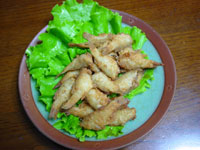 | いしもち・・・1パック | 1.さっと洗って、はらわたや頭を取る。(むなびれを持って頭の方へ引っ張ると1回で取れます) 2.キッチンペーパーで水気をとり、ナイロン袋にから揚げ粉を入れ、その中に@の魚を入れて数回振る。 3.熱した油でカラリと揚げる。 |