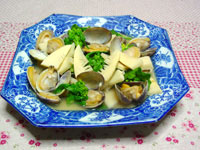 1.あさりは砂を抜き、水でこすり洗いをして表面の汚れを取る。 2.ゆでたけのこは縦半分に切ってから根元は横3mm厚さに切り、穂先は縦に3mm厚さに切る。 3.鍋にあさりを入れ、酒50ccを加えて火にかける。あさりの口が開いたら取り出す。その蒸し汁に水150ccを加えて煮立て調味料を入れる。そこへたけのこを入れて5分煮る。 4.Bにあさりをもどし、菜の花も加えてさっと煮る。 |