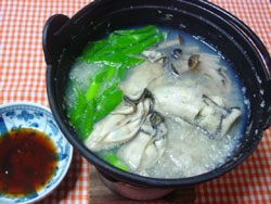 | ここ相生は良港があり、牡蠣の筏が浮かんでいるのを見て育ちました。 木枯らしが吹き始めると店先に牡蠣が並びます。それを見るとかき鍋を食べたくなります。 今回は大根おろしをたっぷりと入れてみぞれ鍋を作りました。心も身体もほっこりします。 |