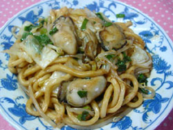 @、フライパンにサラダオイルを入れて、振り洗いしたカキを焦げめが出来るまで両面じっくり焼き、皿に取り出す。 A、@のフライパンに食べやすい大きさに切ったキャベツ、もやし、ネギを入れて炒める。 B、野菜がしんなりしたら、うどんを入れて湯を少しかけてからほぐす。 C、カキを戻し入れ、たれをかけて混ぜ合わせる。 |