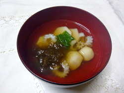 1.小芋は皮を剥き、食べやすい大きさに切る。イカも皮や内臓を取り除き、食べやすい大きさに切る。 2.鍋に水を入れて、小芋とイカを入れて煮る。 3.煮あがったら、淡口しょうゆ・塩・酒で味を調える。 4.器にもったら、とろろ昆布を入れ、青味をのせる。 |