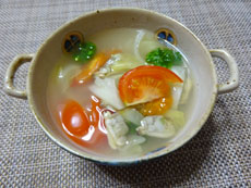 1.キャベツはざく切り、トマトはくし型に切る。ベーコンは1cm幅に切る。 2.鍋にキャベツ・ベーコンとあさり缶を汁ごと入れ、そこへ水・酒を入れて煮る。一煮たちしたらトマトと酢を少々入れ、塩コショウで味をつける。 3.仕上げにごま油をたらし、あればパセリを散らして出来上がり。 |