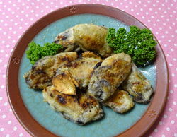 牡蠣はそのままでも美味しいのですが、ニンニクの香りで焼くと更にアップします。 |