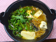 | 鯖缶・・・1缶(味付き) 白菜キムチ・・・150g 木綿豆腐・・・半丁(150g) 春菊・・・30g 水・・・1.5カップ 酒・・・大1 |