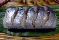 1.ご飯に、ラッキョのみじん切りと甘酢、レモン汁、塩を入れて混ぜ、 棒状に固めておく。 2.@の上にしめ鯖を置き、ラップで包む。しばらく、そのまま置いてなじませる。 3.ラップを取って、切り、オリーブオイルを刷毛で塗る。(鯖の臭みを取るため) |