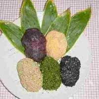 1、1時間、水につけておく。 2、レンジで21分 1合ー7分めやす 3合ー7分×3合=21分 10分後に、1回だけ底から混ぜる。 3、シロップ(水300cc+さとう200g)をわかす。 あつあつのシロップをもち米2の中へいれ、蒸らす。 4、冷めると、おはぎの形ににぎる。 きなこ・白ごま・黒ごま・青のり・あんは表面に!! あん30gは中に!! |
