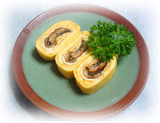 1.フライパンに水と酒を入れて沸かし、うなぎを縦2つに切って入れて温める。汁がなくなる寸前に蒲焼のタレを加えからめる。 2.ボールに卵と調味だしを加えて混ぜる。卵焼き鍋に油をひいて熱し、卵液を一流し分入れ(1/3量)、一度大きくかき混ぜる。半熟になったら、向こう側にうなぎを置き、手前に巻き込んでいく。 3.卵焼きと同じ要領で3回程繰り返して巻いていく。仕上げに4面を焼いて形を整える。 4.食べやすい大きさに切って器に盛る。 |