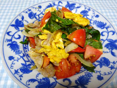 1.肉は細切りにし、しょうゆ・こしょう・すりおろしたにんにくを入れ、15分おく。 2.玉ねぎはくし型に、トマトは食べやすい大きさに切っておく。 3.フライパンにごま油をひき、塩コショウした卵を炒め、別皿に取り出す。 4.そのフライパンに@の肉を入れて強火で炒める。色がついたら別皿に取り出す。 5.そのフライパンに玉ねぎを入れ、塩コショウして炒める。 そこに卵・肉・トマト・バジルを入れ、強火で炒める。 |
