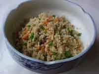 1.干椎茸は水でもどし千切りにする。ごぼうも千切りにして、水につけあくをとる。人参も千切りにする。ねぎは小口切りにする。フライパンにゴマ油を熱し、干し海老・人参・ごぼう・椎茸をしんなりするまで炒め、最後にねぎを入れる。