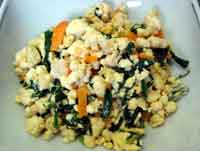 1.豆腐は軽く握って水をきっておく。 2.ニラは5cmの長さに切り、人参は千切り。 3.フライパンに油を熱し、人参と鶏ひき肉を炒める。 4.Bに豆腐を加えて塩・こしょうを加える。 5.ニラを入れてさっと混ぜ、とき卵と醤油を加えてポロポロになるまで炒る。 |