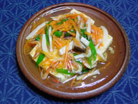 1.人参は千切り、ねぎは斜め切り、エリンギは短冊切りにする。 2.鍋にだし1.5カップを入れ、人参とエリンギを入れて煮る。調味料を加え、片栗粉大さじ1を水大さじ2で溶いて加えとろみをつける。桜えびとねぎを入れて一煮立ちさせる。 3.豆腐は八つに切り、油大さじ1を熱したフライパンで焼いて皿にとり、Aのあんをかける。 |