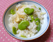 1.鞘を開き、豆を取り出す。沸騰した湯に塩を1つまみ入れて、3分茹でる。冷ましてから皮を取る。 2.炊飯器に普通の水加減で、細く切ったうすあげと千切りにした生姜を入れて、塩1つまみ入れて炊く。 3.炊き上がったら、@のそら豆を入れてサックリ混ぜる。 |